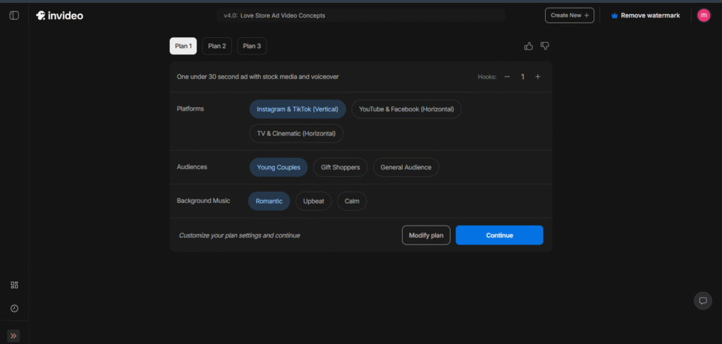 InVideo AI also lets users choose from multiple aspect ratios like 16:9 (landscape), 1:1 (square), and 9:16 (vertical). This makes it easy to tailor content for different platforms without manually resizing or re-editing your video.